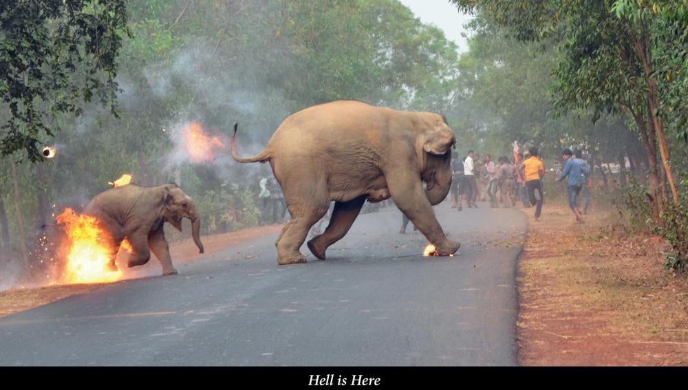 La imagen muestra a un elefante adulto intentado escapar de las llamas seguido de su cría, cuyas patas traseras están en llamas. Según recoge la BBC, fueron varios individuos quienes lanzaron bombas de alquitrán a los elefantes.