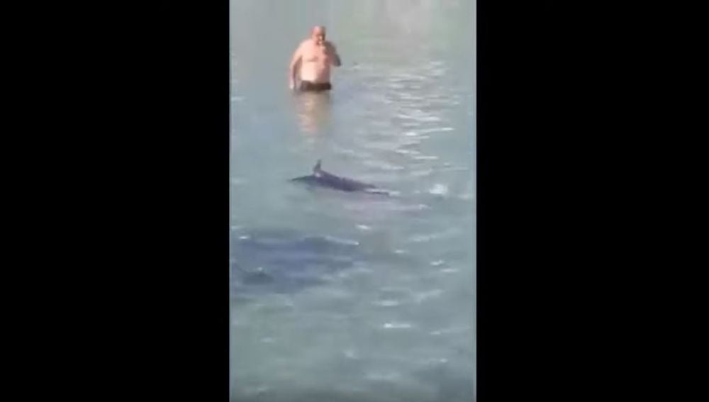 En las imágenes se ve a unos turistas que lanzan piedras al pez espada e incluso se tiran al agua para intentar cogerlo.
