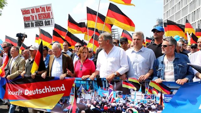 La marcha de AfD se inició con una concentración en la Washingtonplatz, al frente de la estación central de Berlín. Muchos manifestantes portaban banderas alemanas pero algunos también llevaban banderas de uso habitual en grupos de ultraderecha. Los gritos de los manifestantes y las consignas escritas en sus carteles mostraban que la marcha de AfD estaba dirigida a los enemigos habituales de ese partido: la canciller Angela Merkel, el Islam, los refugiados y la política de fronteras abiertas.