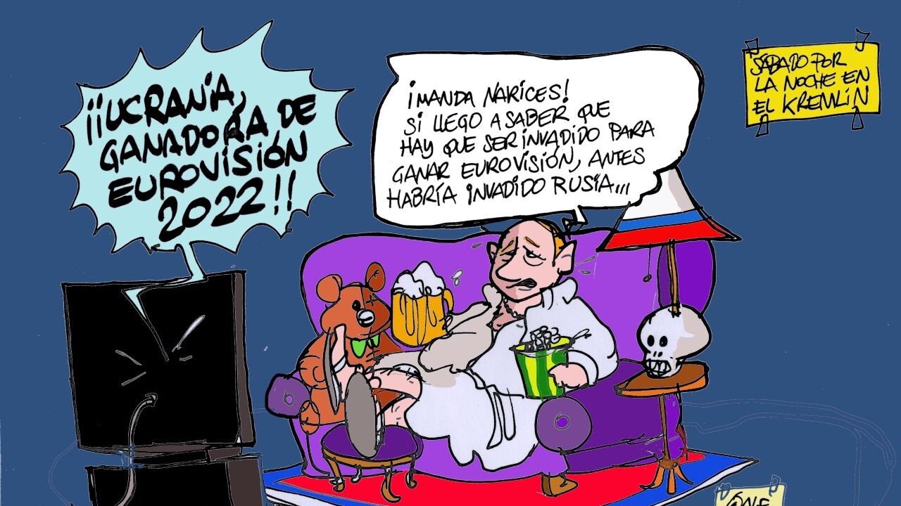 Alfredo Boto-Hervás ha querido reflejar en su viñeta gráfica de la semana cómo vivió el presidente ruso, Vladimir Putin, la victoria ucraniana. "¡Manda narices! Si llego a saber que hay que ser invadido para ganar eurovisión, antes habría invadido Rusia", son las palabras que pone el ilustrador en boca de Putin.