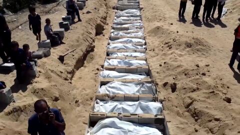 En medio de la devastación que sigue golpeando a la Franja de Gaza, decenas de palestinos entierran a más de medio centenar de cuerpos sin identificar.