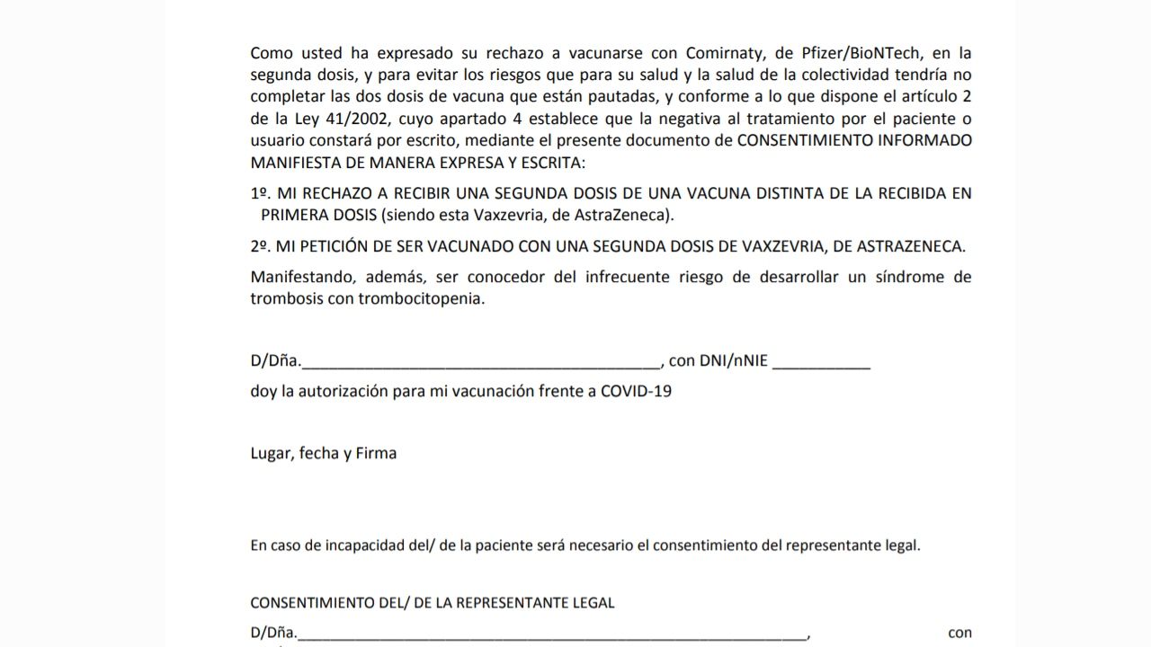 Los menores de 60 años vacunados con AstraZeneca tendrán que decidir si se les pincha una segunda dosis de AstraZeneca o si optan por una de Pfizer. Si eligen recibir el segundo pinchazo de AstraZeneca tendrán que firmar un consentimiento.