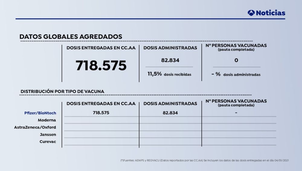 España recibe cada semana una remesa de 360.000 dosis de la vacuna del coronavirus, aunque en estos primeros siete días, que han coincido con los festivos por la Navidad, la campaña de vacunación no se ha desarrollado con la rapidez prevista.
