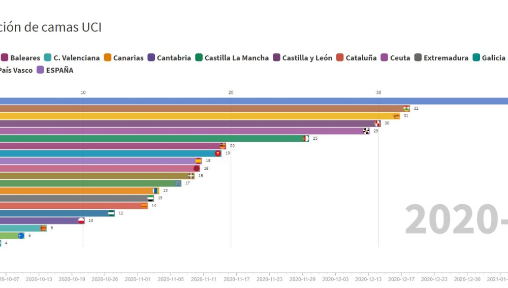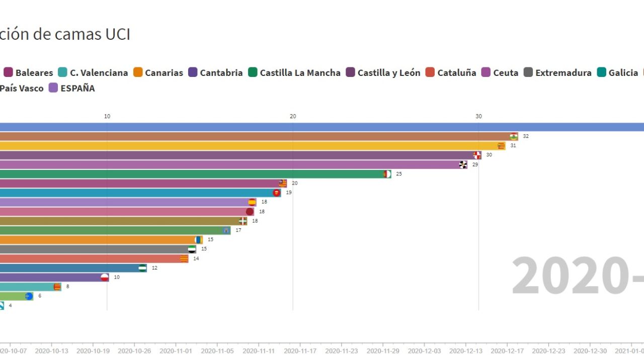 ¿Cuál es el grado de ocupación de las camas UCI de cada comunidad autónoma? Este dato, clave para saber la presión que el coronavirus ejerce en los hospitales de una región, puede consultarse a tiempo real en el siguiente gráfico. En el mismo se muestra cómo ha evolucionado la ocupación de las camas UCI en cada comunidad autónoma y en España desde el 21 de septiembre de 2020 hasta el día de hoy.