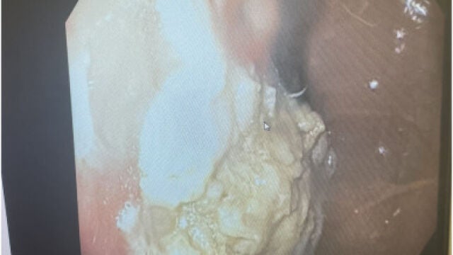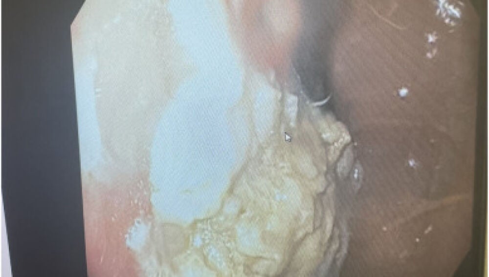 El TAC reveló que el paciente tenía una gran masa, que los médicos denominan 'bezoar', ocupando un 25% de espacio en el estómago. Tras barajar varias opciones, los doctores decidieron sacar el chicle a través del gargante mediante un esofagospio. Así, extrajeron el 'bezoar' a través de este tubo de metal hueco.