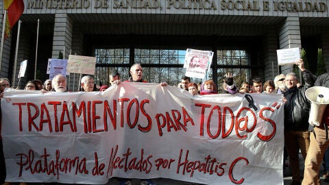 La Plataforma de Afectados por la Hepatitis C se ha concentrado frente al Ministerio de Sanidad, Servicios Sociales e Igualdad donde los manifestantes han formado una cadena humana ante la fachada principal para exigir que todos los enfermos con esta patología tengan acceso a los nuevos tratamientos.