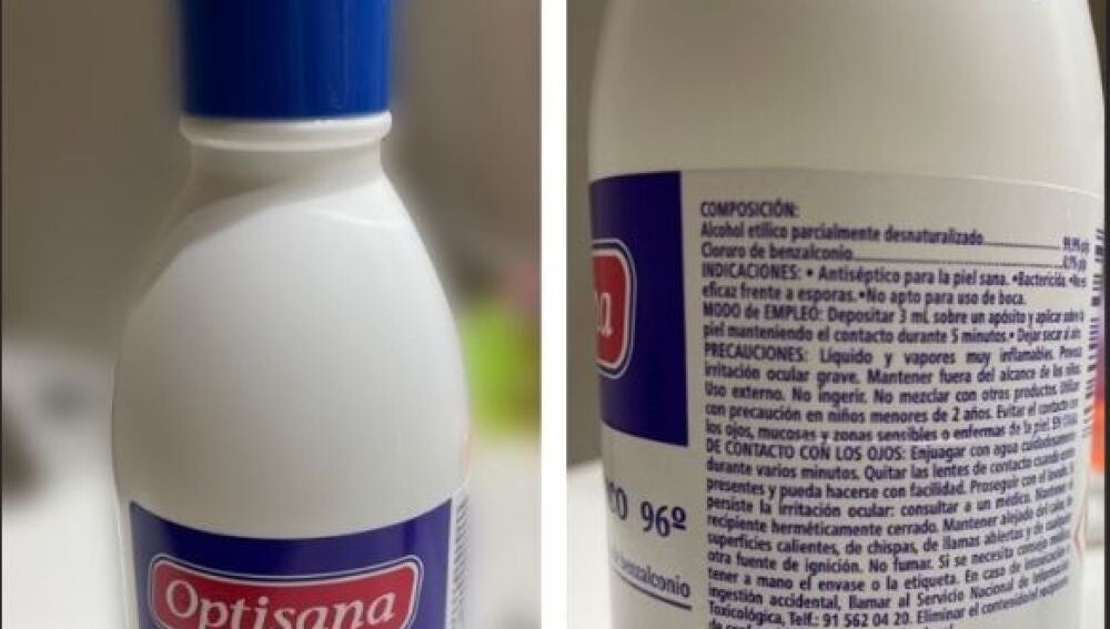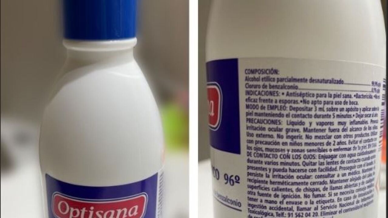 Se trata de Optisana Alcohol 96º que en su etiquetado indica que tiene alcohol etílico 96º reforzado con cloruro de benzalconio y en realidad lo que lleva es agua oxigenada.