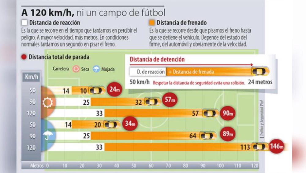 Si hay sol y el vehículo va a 90 km/h recorrerá 57 metros antes de pararse. Sin embargo, si la carretera está mojada el coche se parará a los 89 metros.