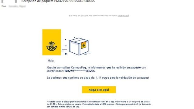 La estafa avisa al usuario de que ha recibido un paquete con un determinado identificador y debe realizar un pago de 1,17 euros para poder validarlo.Entre las principales características de este phishing destacan que el correo enviado se identifica como CorreosPaq utilizando el logotipo de Correos y el formato habitual de correos electrónicos utilizado por la empresa.