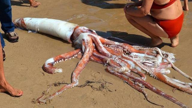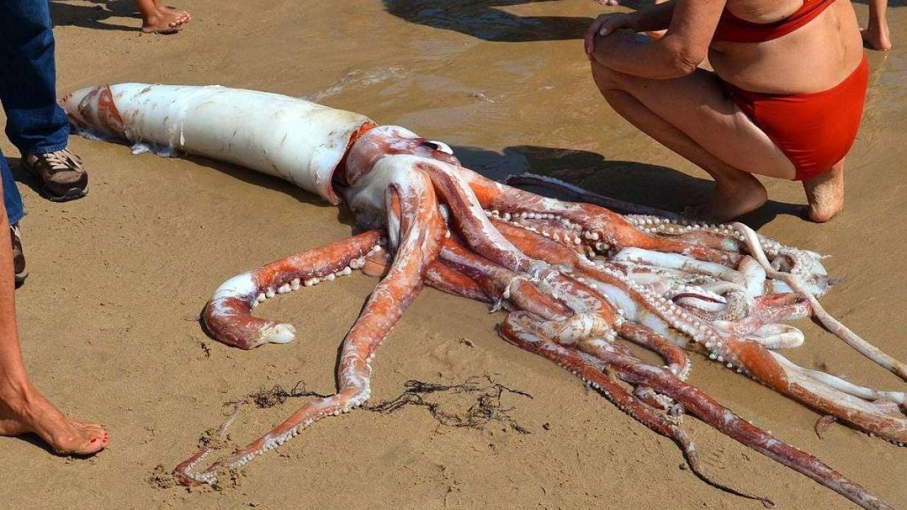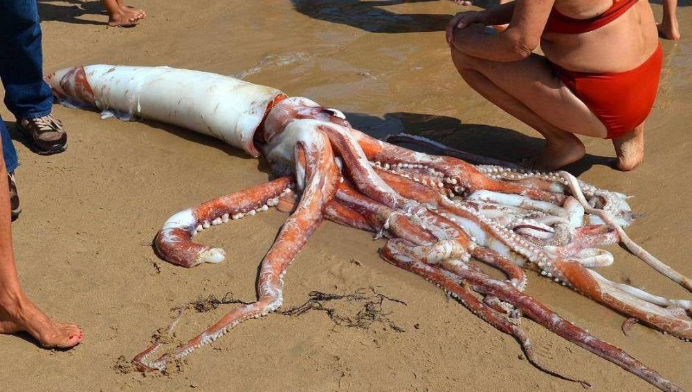 Según informa el Ayuntamiento de Llanes, este marte un bañista que se encontraba en la playa de El Sablón, en Llanes, encontró un calamar gigante flotando en el agua y lo sacó del mar para ponerlo en la arena.
