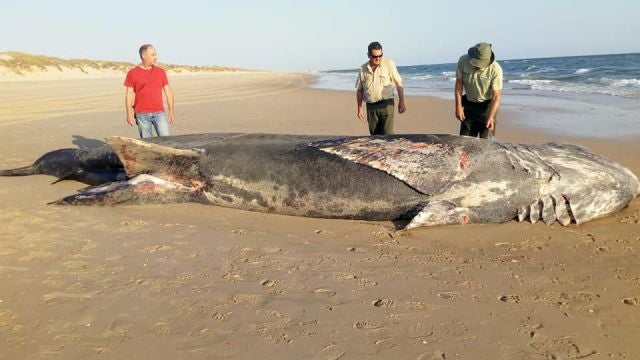 El cadáver de un tiburón peregrino (Cetorhinus maximus), de unos nueve metros, ha varado en la playa del Espacio Natural de Doñana (END), a la altura de la zona conocida como Torre Carbonero. El cuerpo del animal, el segundo pez más grande del mundo, sólo por debajo del tiburón ballena, que puede llegar a medir hasta 10 metros, fue hallado el martes por la tarde, según han informado desde el END.