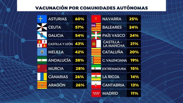 Le sigue Galicia, con el 54% suministrado, es decir, 20.265 de las 37.555 dosis que tienen hasta el momento.