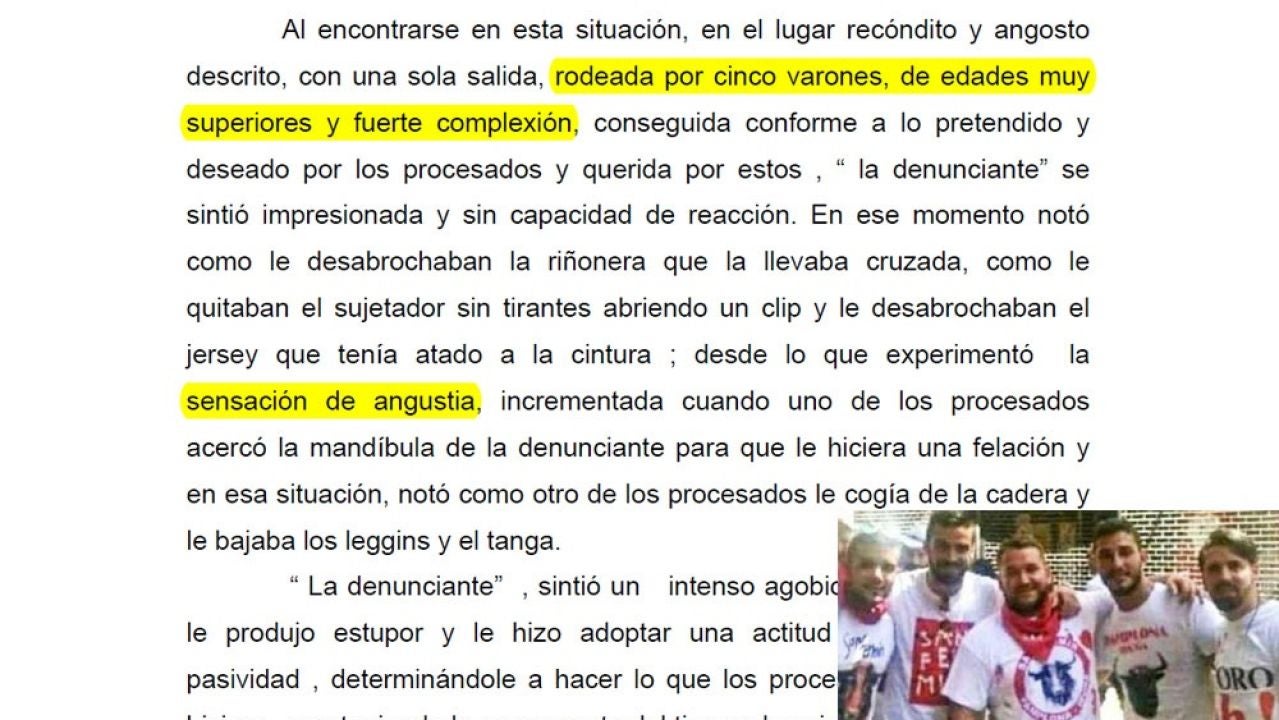 La sentencia dictada por la Sección Segunda de la Audiencia de Navarra y que condena por abuso sexual a los cinco miembros de 'La Manada' recoge que "las acusaciones no han probado el empleo de un medio físico para doblegar la voluntad de la denunciante, que con arreglo a la doctrina jurisprudencial implica una agresión real más o menos violenta, o por medio de golpes, empujones, desgarros; es decir, fuerza eficaz y suficiente para vencer la voluntad de la denunciante y obligarle a realizar actos de naturaleza sexual, integrando de este modo la violencia como elemento normativo del tipo de agresión sexual".