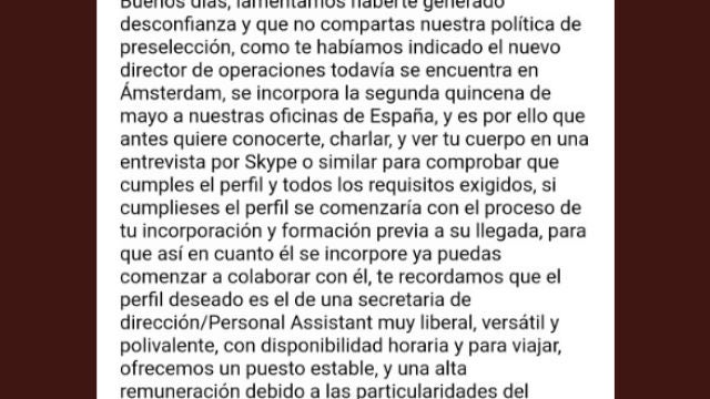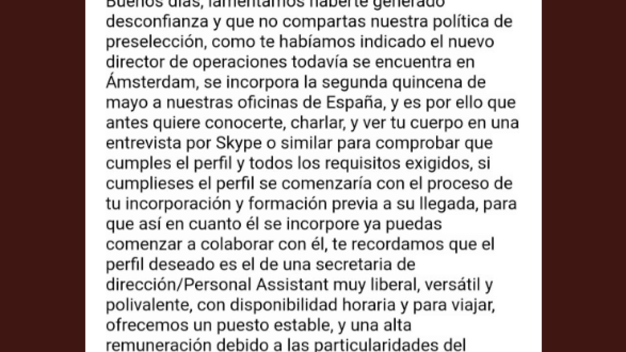 Posteriormente y también a través del mail, la empresa se vuelve a poner en contacto con @Relatofeminista lamentando "haber generado desconfianza" y le informa de que "el nuevo director de operaciones todavía se encuentra en Ámsterdam, se incorpora la segunda quincena de mayo a nuestras oficinas en España y es por ello que antes quiere conocerte". Le llegan incluso a proponer una entrevista por Skype para "comprobar si cumple el perfil".