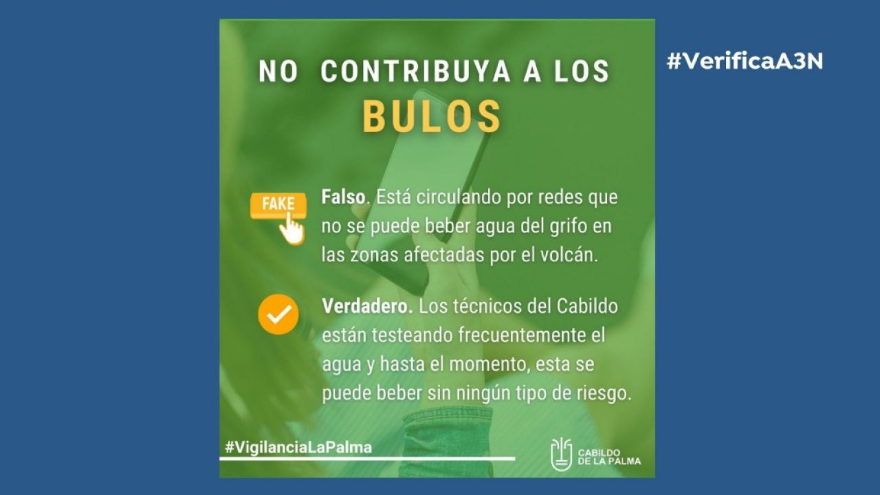 No es cierto que no se pueda beber agua del grifo en las zonas afectadas por la erupción del volcán de La Palma. En las últimas horas ha circulado este bulo que desde el Cabildo de la Palma han desmentido. Todos los detalles en una nueva entrega de Verifica A3N.