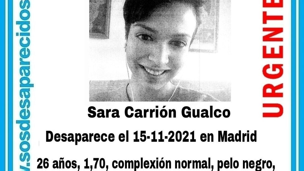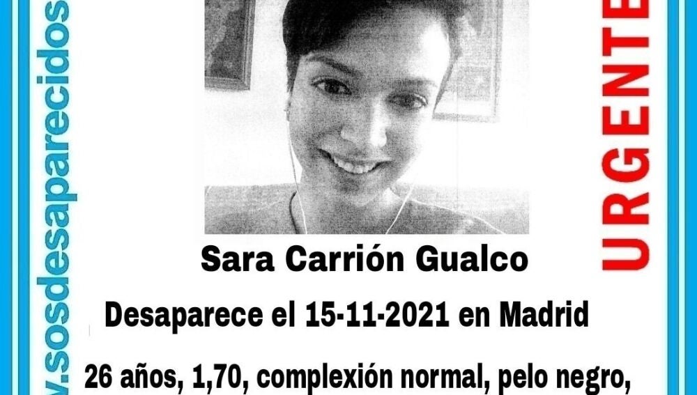 El Centro Nacional de Desaparecidos y la asociación SOS Desaparecidos han alertado sobre la desaparición de una joven de 26 en Madrid. Se trata de Sara Carrión Gualco, a la que se le perdió el rastro el pasado 15 de noviembre. Es una chica de ojos y pelo negro. Mide 1,70 metros y pesa 60 kilos. La última vez que se le vio vestía con un chubasquero negro, una bufanda amarilla, un pantalón deportivo negro, un pequeño bolso marrón y unas deportivas negras.
