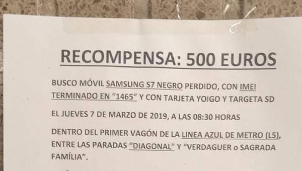 El hombre colgó carteles en Barcelona para que le ayudasen a encontrar su móvil y pide que nadie quite el cartel por que "es la única esperanza de recuperar las fotos de mi hija", concluye.