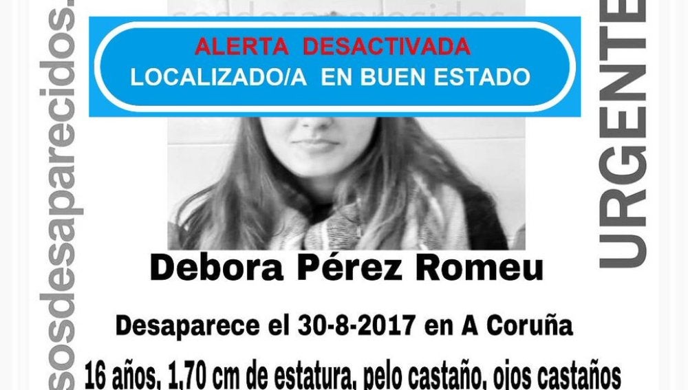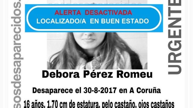 La joven de 16 años que permanecía desaparecida desde el pasado 30 de agosto, día en el que fue vista por última vez en la ciudad de A Coruña, ya ha sido encontrada, según ha informado este domingo SOS Desaparecidos.