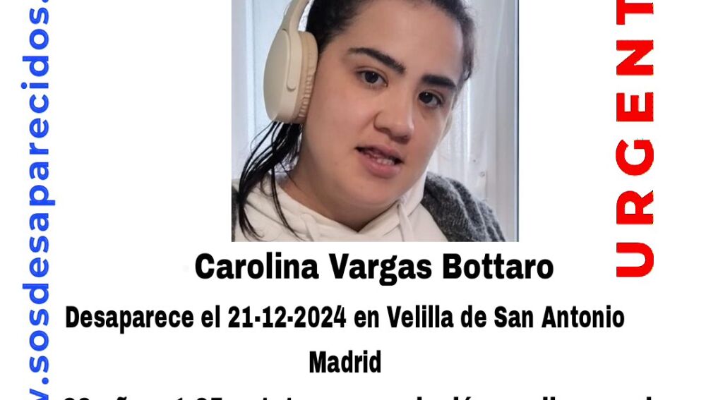 Carolina Vargas Bottaro, de 29 años, está desaparecida desde el pasado 21 de diciembre en Velilla de San Antonio, Madrid. La joven, descrita como vulnerable y residente en un centro para personas con discapacidad intelectual en Arroyomolinos, fue vista por última vez junto a un compañero de su residencia. Desde entonces, no se ha sabido nada de ella, y la preocupación de su familia y de las autoridades va en aumento.