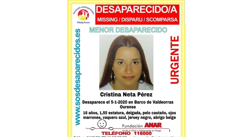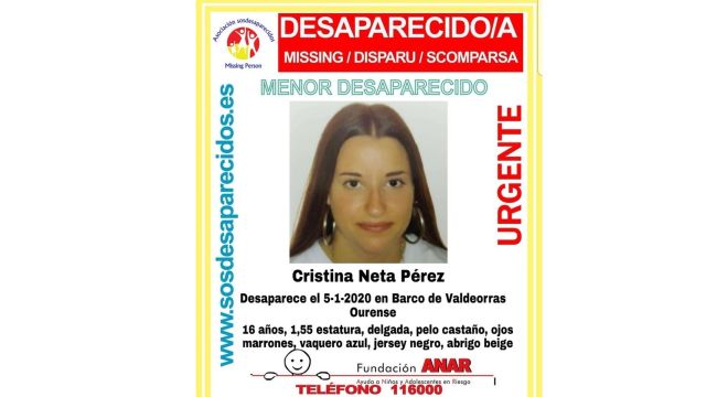 En el aviso difundido por SOS Desaparecidos se apunta que la joven es Cristina Neta Pérez, de 16 años, delgada, de pelo y ojos castaños. La última que la vieron llevaba unos vaqueros azules, un jersey negro y un abrigo beige.