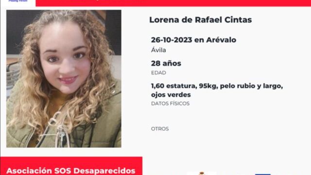 Lorena de Rafael Cinta fue vista por última vez el pasado 26 de octubre en la localidad abulense de Arévalo, desde entonces su familia la busca. La joven tiene 28 años y su madre asegura que muestra "altas capacidades para manipular".