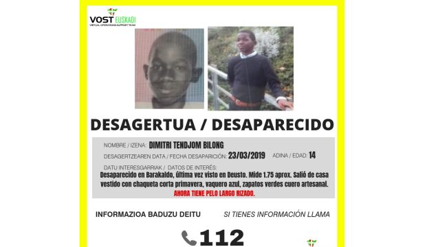 La Ertzaintza busca a un menor de 14 años de edad que está desaparecido desde el pasado 23 de marzo, según ha informado Vost Euskadi en su cuenta de Twitter. El joven de color, y que mide aproximadamente 1,75 metros, fue visto por última vez en el barrio bilbaíno de Deusto y vestía "chaqueta corta primavera, vaquero azul y zapatos verdes".