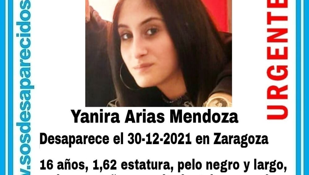 Yanira Arias Mendoza es vecina de Zaragoza, tiene 16 años, mide 1,62, tiene el pelo negro y largo, además de ojos castaños. En el momento de la desaparición portaba un carrito 'bugaboo' de color marrón. En caso de tener cualquier pista sobre el paradero de Yanira, es importante que se comunique a las autoridades. Además, el teléfono de SOS Desaparecidos es el 642650775.