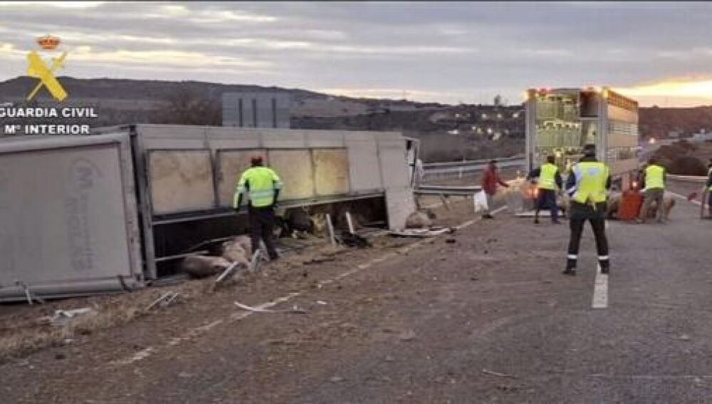 La autovía A-22 permanece cortada a la altura del municipio de Monzón (Huesca) tras volcar esta madrugada un camión articulado que transportaba 170 cerdos, tal y como informa la Comandancia de la Guardia Civil de la provincia altoaragonesa.