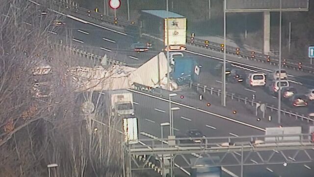 Tal y como ha detallado el propio cuerpo de bomberos, el camión portaba policarbonato para hacer plástico y ha sido a las 17:45 horas del lunes cuando han puesto en marcha un plan ante el riesgo de incendio. El vehículo ha quedado volcado en perpendicular a la calzada, por encima de la mediana y ocupando ambos sentidos de la carretera.