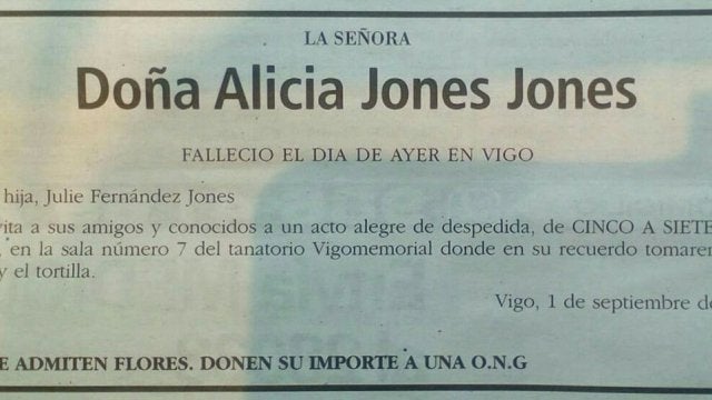 La esquela de Alicia Jones Jones, fallecida el 31 de agosto en Vigo y publicada el 1 de septiembre en Faro de Vigo, decía lo siguiente: "Su hija, Julie Fernández Jones, invita a sus amigos y conocidos a un acto alegre de despedida (...) en su recuerdo tomaremos vino y tortilla. No se admiten flores. Donen su importe a una ONG". La escritora gallega y usuaria de Twitter @LediciaCostas publicó en la red social la esquela, que también se publicó en Facebook a través de otras cuentas.