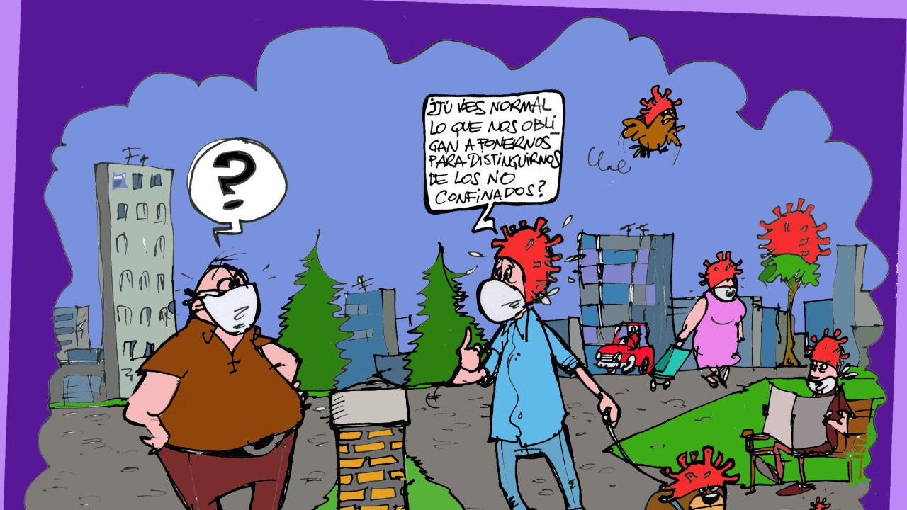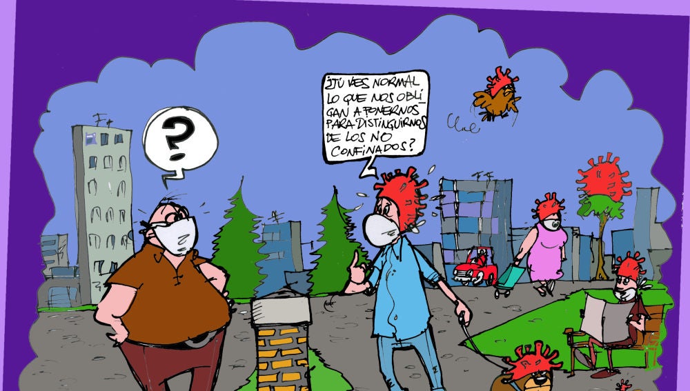 Nuestro ilustrador Alfredo Boto-Hervás, se ha hecho eco de estas restricciones y ha dibujado una viñeta en la que se ven a unos vecinos confinados en su barrio... y al otro lado de la calle, vecinos que no lo están.