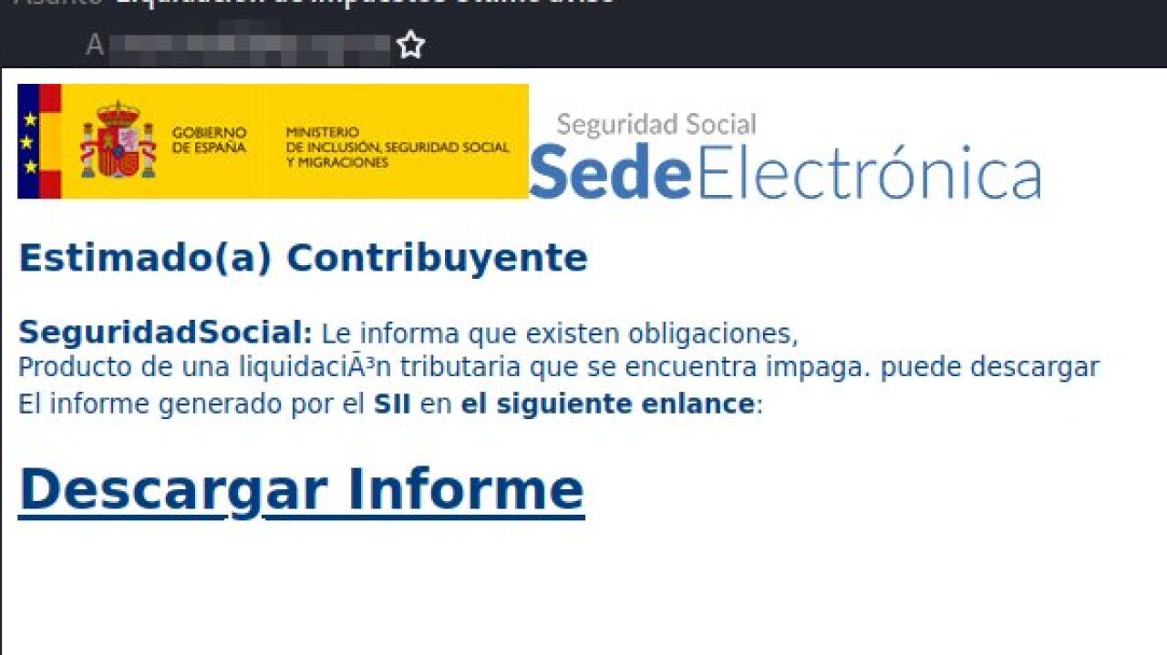 En este último timo, la Guardia Civil ha alertado a la ciudadanía que se ha detectado una campaña de correos electrónicos suplantando a la Seguridad Social "que usan como gancho un impago de una liquidación tributaria". Piden no picar en la trampa ya que el enlace redirige a una web donde se descarga un archivo malware que infecta el dispositivo.