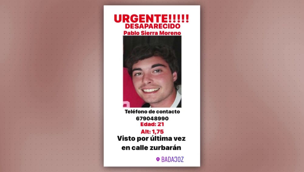 Pablo Sierra fue visto por última vez en la madrugada del 2 al 3 de diciembre en la calle Zurbarán de Badajoz. Había salido con unos amigos a una zona de pubs y tenía previsto ir a su pueblo al día siguiente con sus hermanos para ir a pasar el puente.