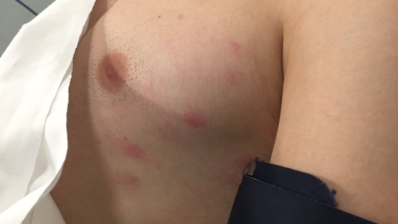 Al lugar tuvo que asistir una ambulancia para atender al joven que permaneció ingresado un par de hora hasta que se recuperó de la conmoción. En unas fotografías realizadas por su pareja durante el ingreso se observan varios moratones en el toráx.