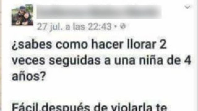 El joven escribió en su perfil de la red social: "¿Sabes cómo hacer llorar dos veces seguidas a una niña de cuatro años? Fácil. Después de violarla te limpias la polla con su peluche favorito".