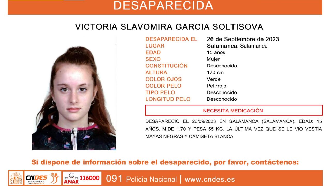La Policía Nacional ha alertado recientemente de la desaparición de una joven adolescente de 15 años en Salamanca. El nombre de la menor es Victoria Slavomira Gascía Soltisova y lleva en paradero desconocido desde el pasado 26 de septiembre.