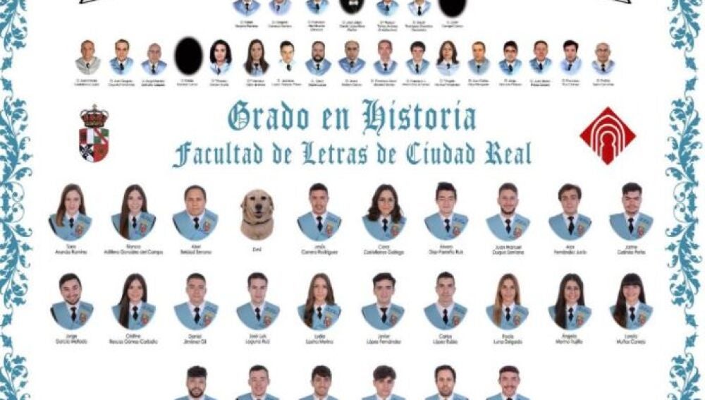 La orla de la promoción del grado de Historia de la Universidad de Castilla-La Mancha ya ha pasado a la historia. Desi, una perra labradora que acompaña a Abel, un alumno ciego de la Universidad, aparece, ni más ni menos, que en la primera fila.