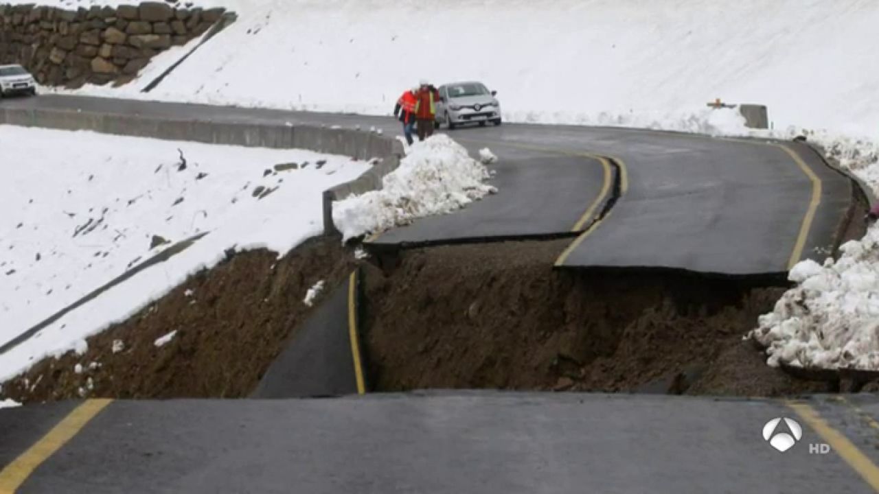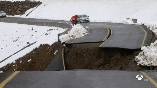 Los técnicos trabajan desde esta madrugada para dar una solución lo antes posible debido a que la vía principal permanece cortada debido a un deslizamiento de ladera que provocó grandes grietas y hundimientos en la calzada.