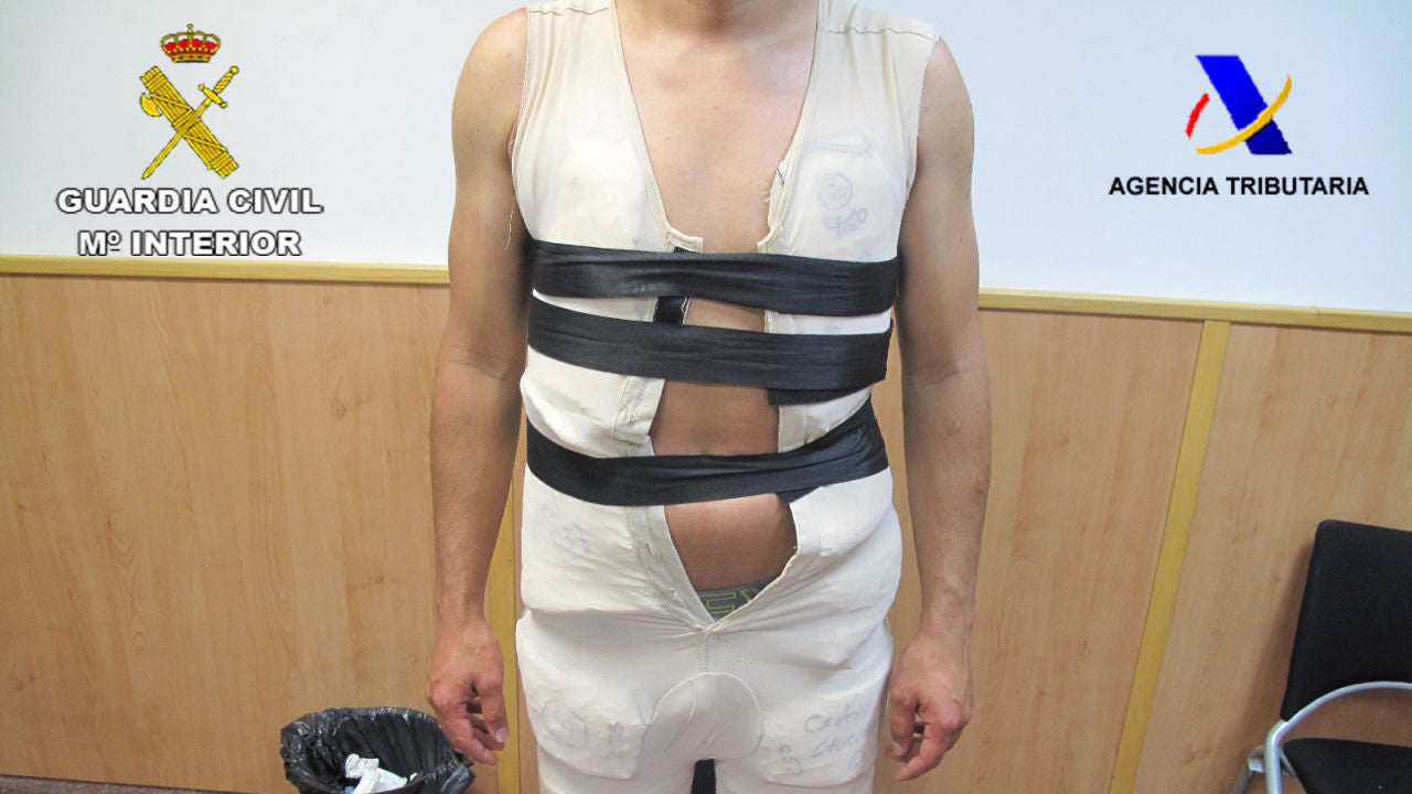 Esta persona había llegado a Barcelona en un vuelo procedente de Bogotá (Colombia) y al acceder a la aduana de la T-1 y ante la sospecha de que pudiera tratar de introducir algún tipo de droga u objeto ilegal en España, se procedió a realizar un examen del pasajero que concluyó con el descubrimiento de que bajo su vestimenta disponía de una faja de tela que le cubría prácticamente todo el cuerpo bajo la cual se ocultaban 15 placas de cocaína, moldeadas y definidas para ajustarse a cada una de las partes de su cuerpo donde iban adheridas.