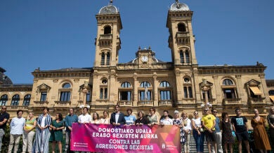 El alcalde, Eneko Goiase y el resto de la Corporación municipal del Ayuntamiento de San Sebastián se concentraron frente al Ayuntamiento paramostrar su repulsa a estos actos y el rechazo a las agresiones sexuales que tuvieron lugar en la ciudad.