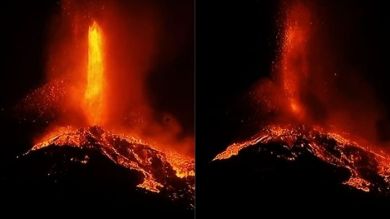 El Instituto Geológico y Minero de España (IGME) publica dos fotografías realizadas con un minuto de diferencia para mostrar el avance de la lava del volcán y la caída de una parte del cono volcánico de Cumbre Vieja que ya lleva dos semanas en erupción.