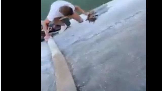 Uno de los jóvenes descendió por la tubería mientras el otro esperaba arriba para poder ayudarle a subir. El chico que bajó intentaba tranquilizar al animal para que no le mordiera y pudiera rescatarlo.