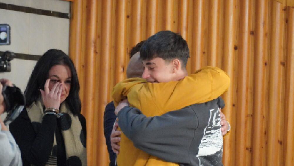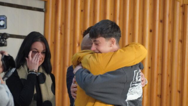 Julio Rodríguez, de 16 años, vuelve a ver al joven al que ayudó a salir del tren siniestrado y a sus padres, días después del accidente ferroviario en Córdoba.