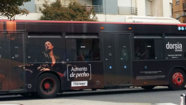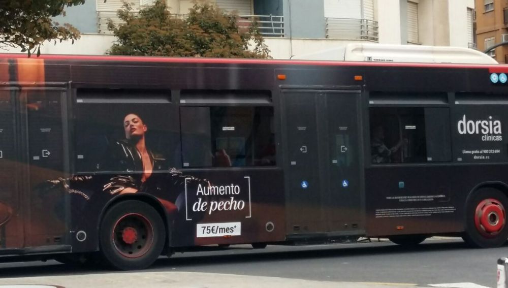 El reclamo cubría todo el lateral de los buses con la imagen de una mujer y destacaba el precio de la intervención de aumento de pecho que ofrece la clínica, según se aprecia en la imagen que ha compartido en Twitter la diputada de Podemos Fabiola Meco.
