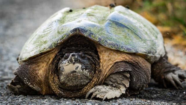 La tortuga Chelydra serpentina es conocida por sus potentes mandíbulas. Las utiliza para cazar al acecho a otros animales como peces, aves, anfibios, mamíferos y otros reptiles.