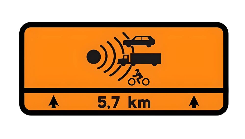 Se trata de una señal algo curiosa, de color naranja, en la que se pueden ver un coche, un camión y una moto, junto a un símbolo que es muy similar al de los radares de velocidad. Debajo, encontramos unos números, indicando la distancia, y una flecha a cada lado, indicando la dirección.