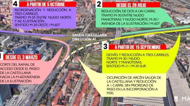 Asimismo, informan que a principios del mes de noviembre quedará cortado el acceso desde la A-1 a la M-30, dirección avenida de la Ilustración/M607/paseo de la Castellana. Desde el ayuntamiento manifiestan que se informará y se señalizarán los correspondientes itinerarios alternativos por las vías de alta capacidad de circunvalación de Madrid y por las calles de los barrios de la ciudad afectados.