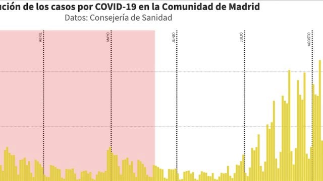 En septiembre, con la segunda ola de casos de coronavirus, la Comunidad de Madrid anunciaba que habían registrado el 11 de septiembre, 5.304 positivos en tan solo 24 horas. Seguido de un descenso de casos durante tres días, con unos 1.600 positivos de media, seguido de otro repunte de 3.885 nuevos casos de coronavirus.