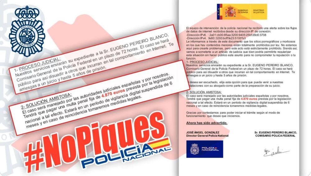 La citación que ha compartido la Policía Nacional para alertar de la estafa comienza así: "le informamos a través de este documento que los sitios pornográficos y morbosos en los que hay contenidos menores están totalmente prohibidos por ley" a lo que le sigue "no estamos aquí para crearle problemas, pero este acto está estrictamente prohibido". La estafa llega más tarde cuando piden casi 5.000 por resolver la (falsa) situación por cerca de 5.000 euros.