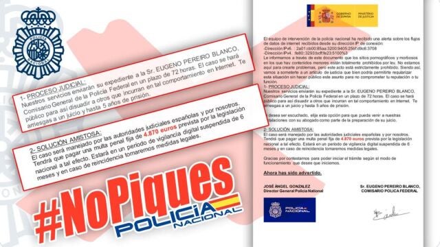 Antes de proponer la solución amistosa remiten a un proceso judicial, que es el siguiente: "nuestros servicios enviarán su expediente a la Sr. Eugeno Pereiro Blanco, Comisario General de la Policía Federal en un plazo de 72 horas. El caso se hará público para así disuadir a otros que incurran en tal comportamiento en internet. Te arriesgas a un juicio y hasta 5 años de prisión" se relata en la citación.
